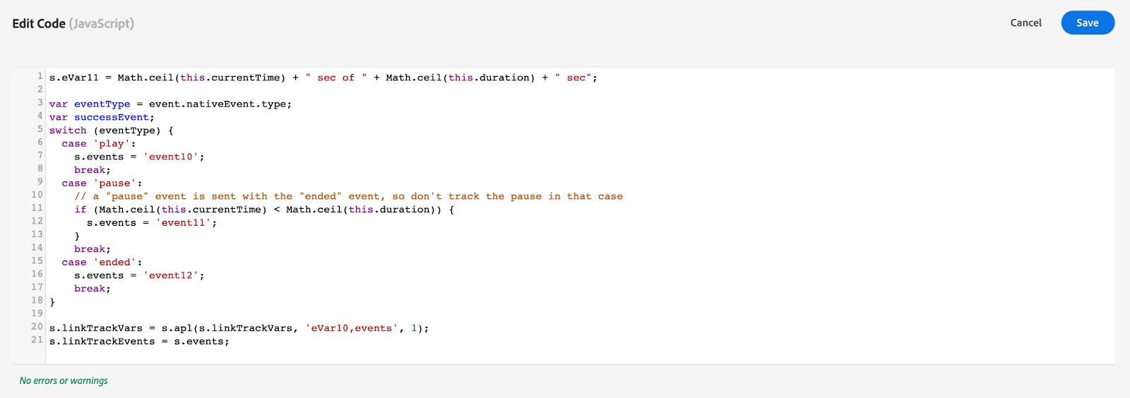 These two lines are required because eVar 11 and the success events will be tracked with a Custom Link later on. I use Adobe Analytics' apl plugin to update the s.linkTrackVars appropriately. This also ensures that the eVar 10 that was set earlier in the Variables section still gets tracked.