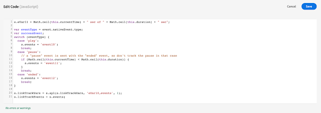 This setup works if you want to track the events with Adobe Analytics' Custom Links. But if you have a licence for Adobe Media Analytics, Adobe's media tracking and reporting solution, then you would want to take advantage of the media "hearbeat" reports that it provides. Tracking video playback to Adobe Media Analytics will be covered in the next post.